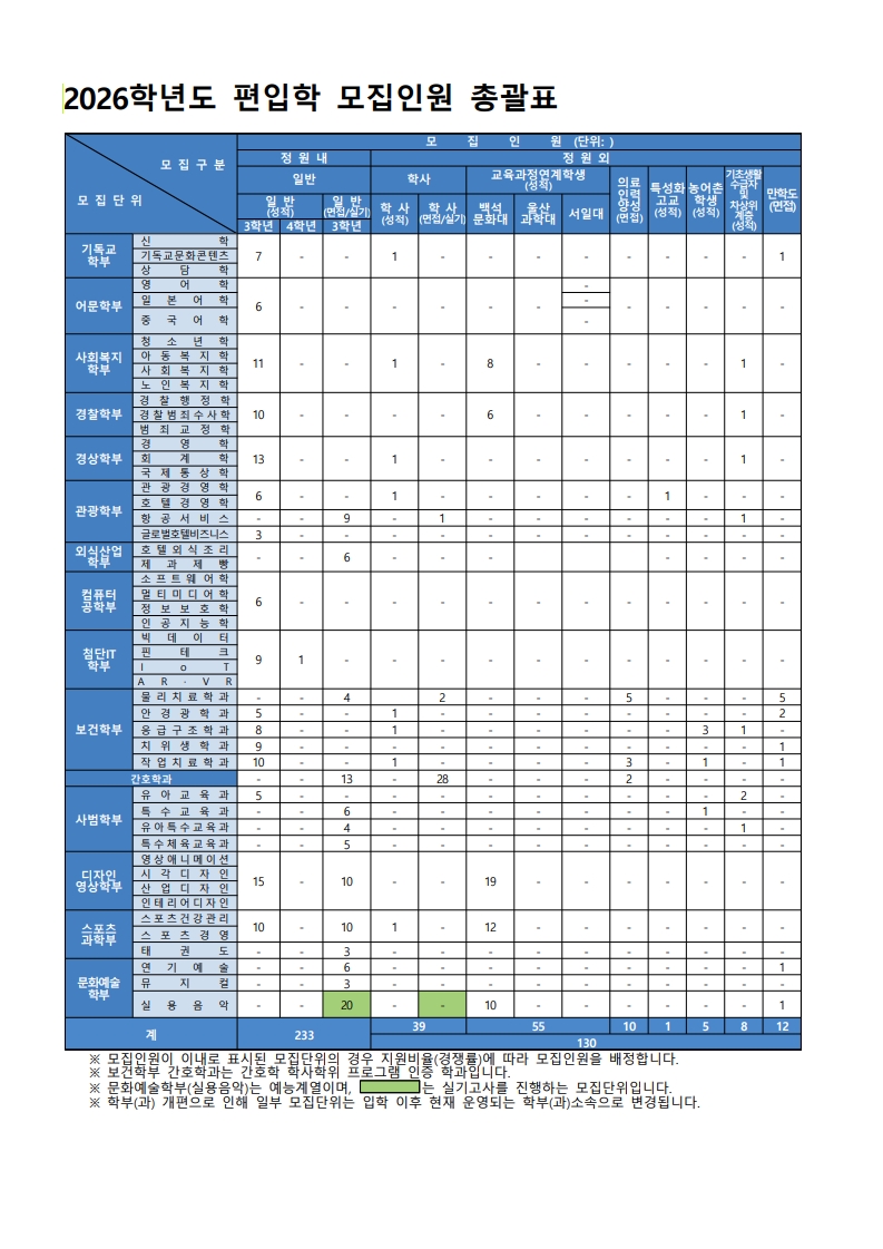 2026학년도 전기 편입학 모집인원을 아래와 같이 공지합니다.